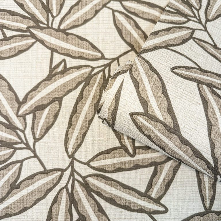 The soft cream tones and modern leaf motif sit beautifully against a tactile grasscloth background, adding rich depth and warmth to any interior. Subtle mica and metallic flecks enhance the surface, catching the light to create a sophisticated, layered finish.