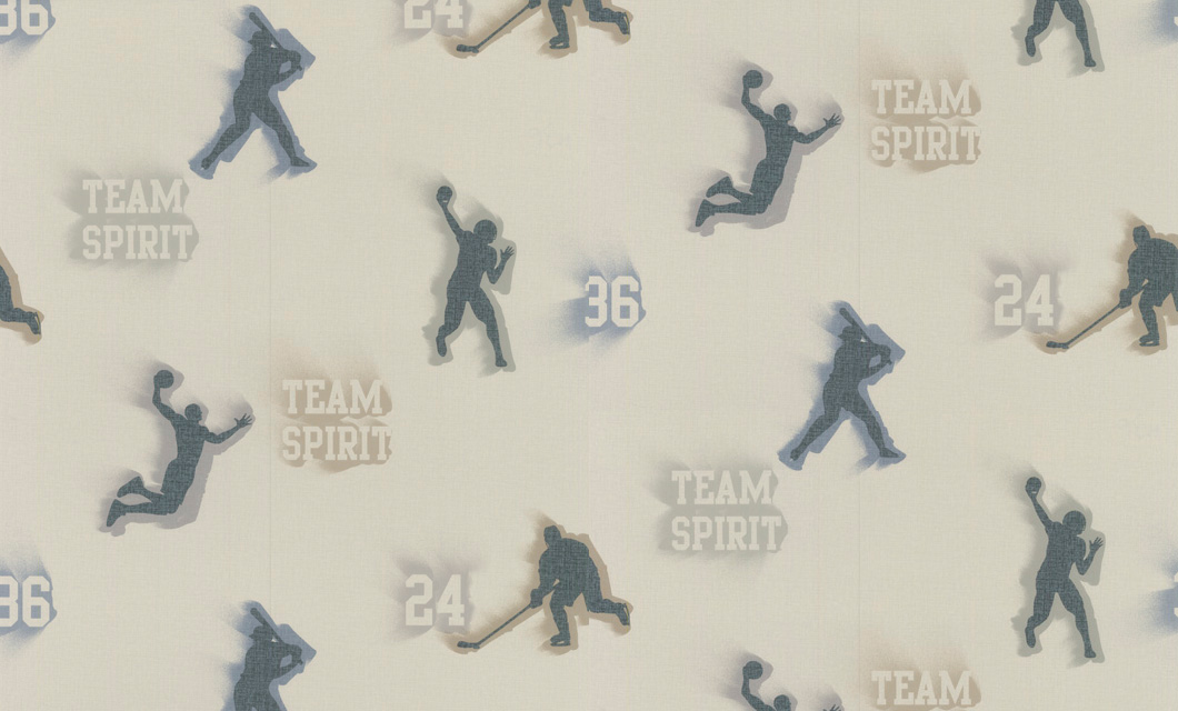 This wallpaper design features a smooth finish and is pre-pasted, making it easy to apply with water or diluted paste can be applied to the back. It has a sports-themed motif with silhouettes of various athletes in action, including baseball, basketball, football, and hockey players. The repeated phrases “TEAM SPIRIT” and jersey-style numbers like “24” and “36” emphasize a theme of athleticism, teamwork, and school spirit.