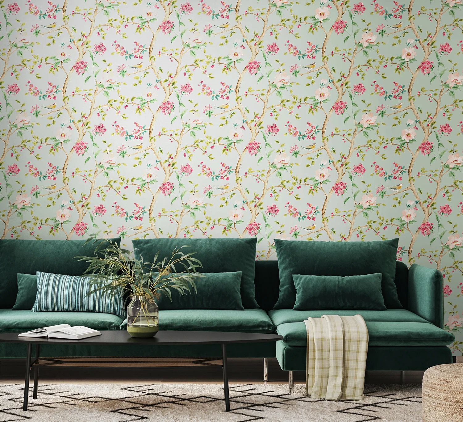 Bird Song Seafoam & Rose wallpaper features blossoming branches, delicate birds, and soft pink florals on a seafoam backdrop, adding timeless botanical elegance with easy application and a seamless finish.