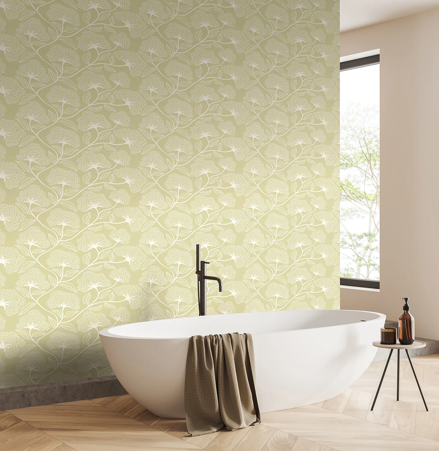 Modern floral wallpaper in a soft pear green with crisp white detailing. Perfect for creating a fresh and elegant look in any room.