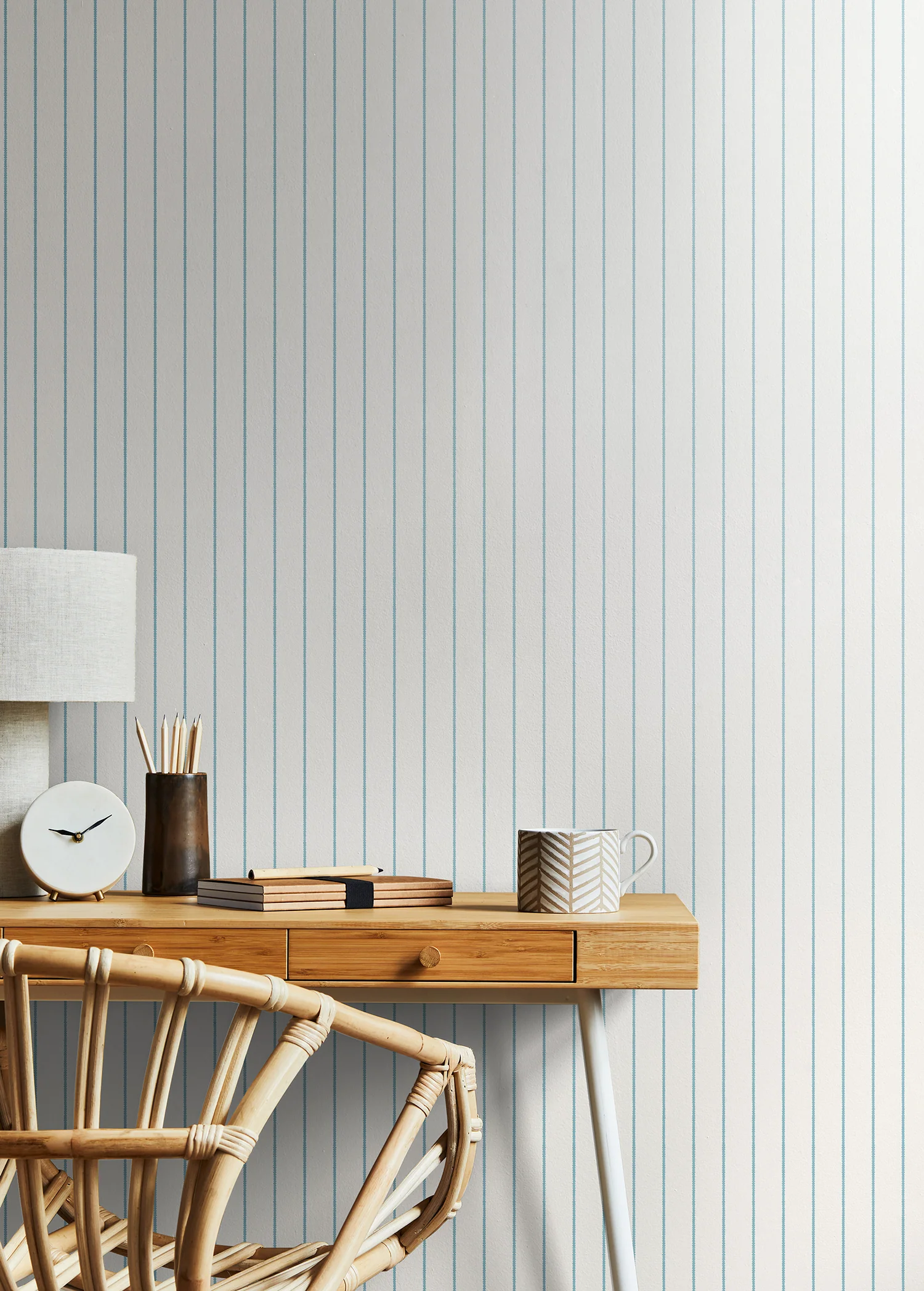 Classic scallop stripe wallpaper in a soft petrol blue. Perfect for creating a timeless and calming atmosphere in any room.