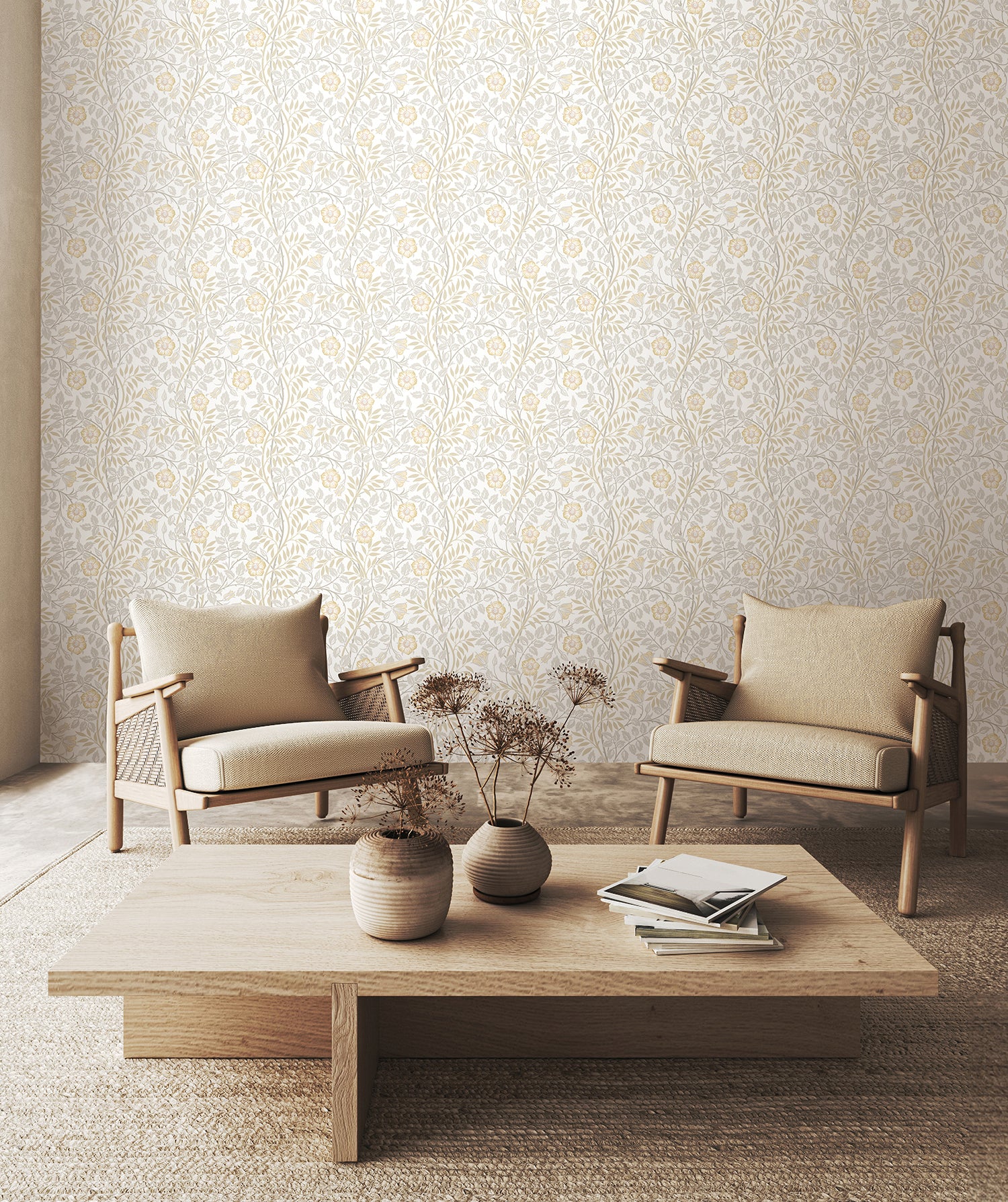 Light, airy, and effortlessly elegant, the Rosehip Trail Natural Stone Wallpaper from the Eden Collection by Hoopla Walls brings a soft botanical beauty to any interior. Featuring delicate rosehip blooms in pale gold and cream, surrounded by subtle stone-toned foliage on a warm off-white background, this design creates a calming and timeless atmosphere.