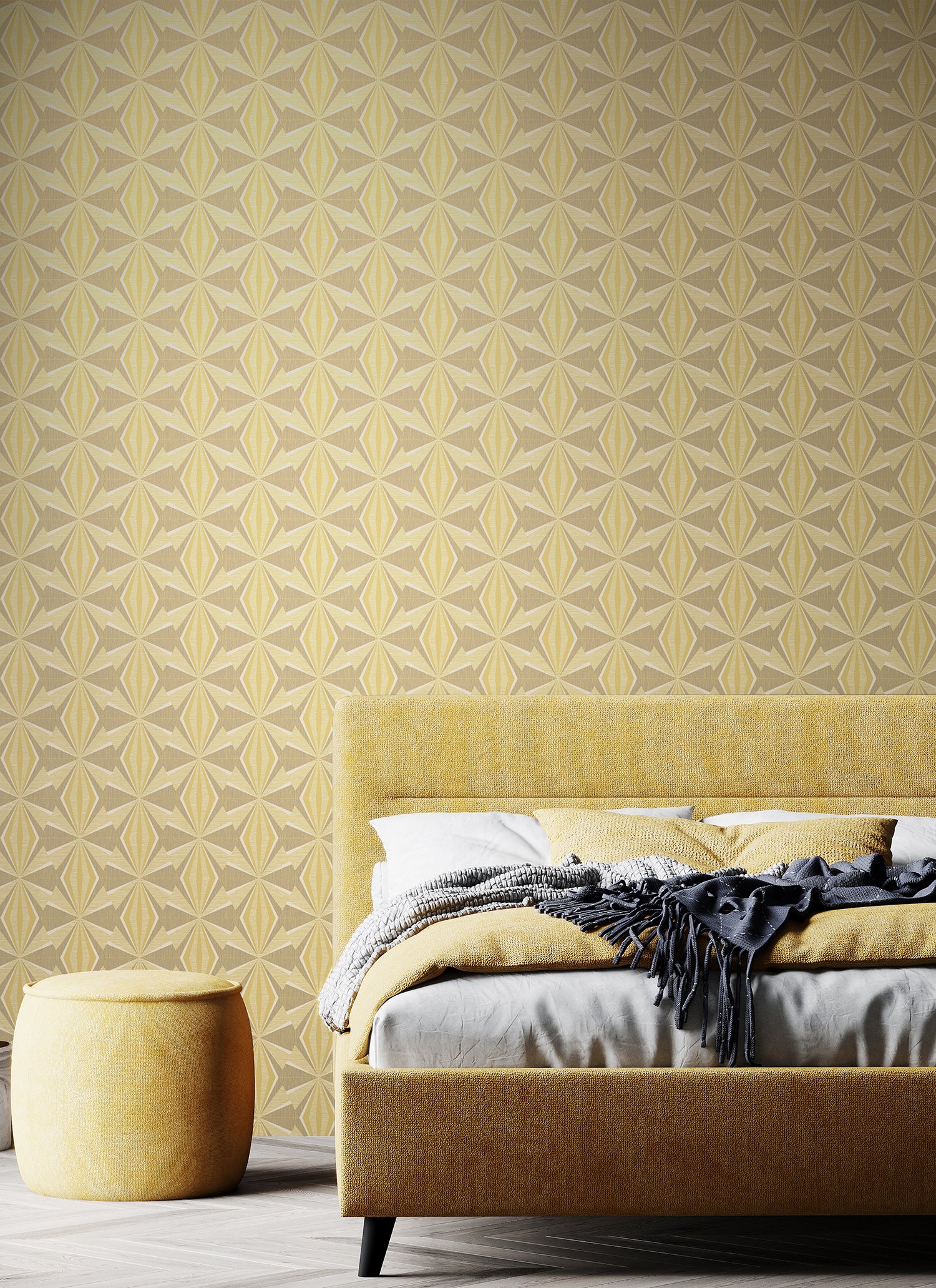 Hoopla Walls Geo Sunray Diamond Warm Grey And Yellow Wallpaper
