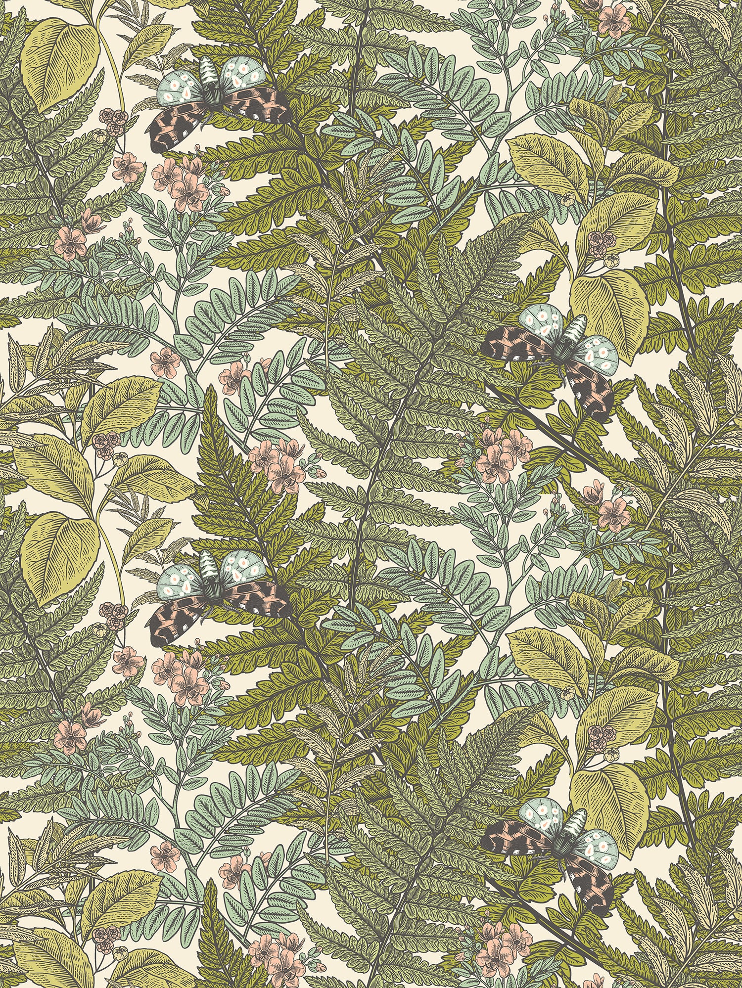 Bring the lush calm of the forest indoors with Wild Ferns Juniper wallpaper from Hoopla Walls’ Fleur Collection. This beautifully illustrated design bursts with layers of fern fronds, wildflowers, and delicate butterflies, all set in soft juniper greens and earthy tones that evoke a sense of organic serenity.
